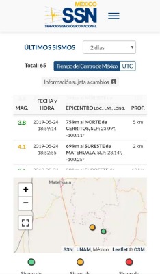 Dos sismos de considerables magnitudes fueron registradas por el Sismológico Nacional el primero de ellos el pasado 24 de mayo a las 18:52 de la tarde aproximadamente a 69 kilómetros al sureste de Matehuala con una magnitud de 4.2 en la escala de Ritcher.