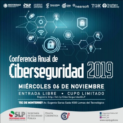 En el marco de la Semana Nacional de Ciberseguridad, la Secretaría de Seguridad Pública a través de su Unidad de Policía Cibernética en colaboración con el Tecnológico de Estudios Superiores de Monterrey, Campus San Luis Potosí, darán inicio al ciclo de conferencias del evento "Conferencia Anual en Ciberseguridad 2019".