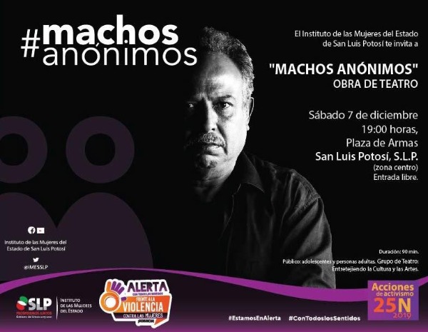 En el marco de las actividades para conmemorar el 25 de noviembre "Día Internacional para la Eliminación de la Violencia Contra la Mujer" y los 16 días de activismo, el Instituto de las Mujeres del Estado (IMES), presentará este sábado 7 de diciembre a las 19:00 en la Plaza de Armas la puesta en escena #MachosAnónimos, informó la titular de la dependencia, Erika Velázquez Gutiérrez.