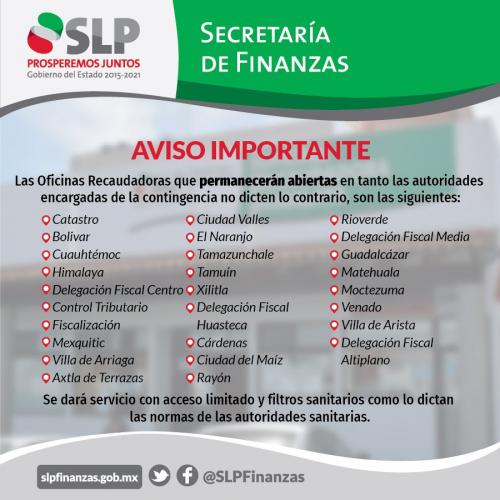 Las Oficinas Recaudadoras que permanecerán abiertas son las ubicadas en: Cuauhtémoc, Himalaya, Soledad de Graciano Sánchez, Catastro, Bolivar, Delegación Fiscal, Mexquitic, Villa de Arriaga, Axtla, Ciudad Valles, El Naranjo, Tamazunchale, TamuÍn, Xilitla, Cárdenas, Cerritos, Ciudad del Maíz, Rayón, Rioverde, San Ciro, Guadalcazar, Matehuala, Moctezuma, Venado Y Villa de Arista