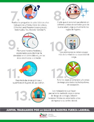 La Secretaría del Trabajo y Previsión Social del Gobierno del Estado de San Luis Potosí, lanzó una campaña de concientización dirigida a las empresas al respecto de las acciones mínimas básicas de prevención en los centros laborales para combatir la contingencia generada por el virus COVID-19 en México.