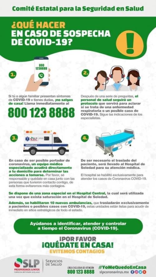 Ante sospechas de presentar algún síntoma relacionado al COVID-19, o si algún familiar los llegara a presentar, tales como tos seca, flema, temperatura mayor a los 37.5 grados, dificultad para respirar, cansancio o debilidad, además de haber tenido contacto con personas procedentes de países con contagios comunitarios o algún caso positivo de Coronavirus, los Servicios de Salud recomiendan no salir de casa y llamar al 800 123 88 88.