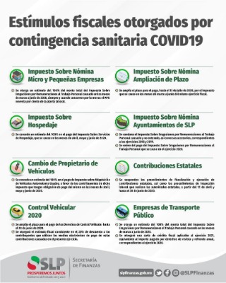 Daniel Pedroza Gaitán, Secretario de Finanzas de Gobierno del Estado, señaló que en la página www.slpfinanzas.gob.mx los contribuyentes podrán encontrar la información de los siguientes estímulos fiscales: Impuesto Sobre Nómina para micro y pequeñas empresas, Ampliación del Plazo del Impuesto Sobre Nómina para todos los contribuyentes, Impuesto Sobre Nómina para Ayuntamientos, Impuesto Sobre Hospedaje, Cambio de Propietario de Vehículos, Control Vehicular 2020, Estímulos para empresas de Transporte Público y Suspensión de fiscalización y ejecución de Contribuciones Estatales.