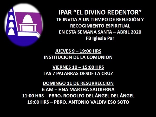 La Iglesia Presbiteriana "El Divino Redentor" hace un llamo a su feligresía a hacer un tiempo de reflexión y recogimiento espiritual en esta Semana Santa 2020, y continuando con las actividades a través de redes sociales, este día a las 19 horas se llevará a cabo la Institución de la Comunión que ante la contingencia del COVID-19 se hará en los hogares.