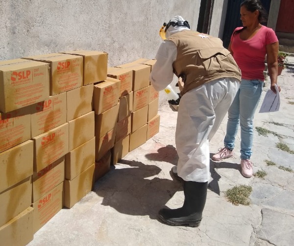 Además de contar con equipo de protección, se asean los espacios en donde se realiza la distribución de los apoyos alimentarios. De igual forma, se aplica sanitizante a las cajas con los insumos y se mantiene la sana distancia.