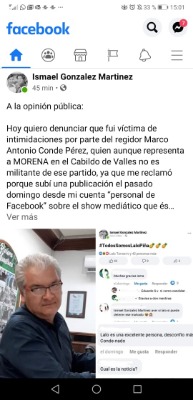 Por su parte, Ismael González denunció públicamente en sus redes sociales que este día fue víctima de intimidaciones por parte del Regidor, quien le reclamó por haber publicado el pasado domingo en su cuenta personal sobre el "show" mediático que protagonizó con Eduardo Saldaña a quien irónicamente, lo acusa de "amenazas e intimidaciones" y recalcó que de ninguna manera dejará de publicar sus opiniones sobre cualquier tema que le parezca, además, que tampoco lo atemoriza el actuar del Regidor.