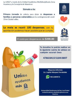 La Consejería de Maestros de la Universidad Autónoma de San Luis Potosí a través de la Unidad Multidisciplinaria Zona Huasteca invitan a la población a unirse a la primera jornada de colecta para dotar de despensas a familias o personas vulnerables por la contingencia Covid-19 en Ciudad Valles y que serán entregadas en la zona tének, informó el director de esta casa de estudios Roberto Llamas Lamas.