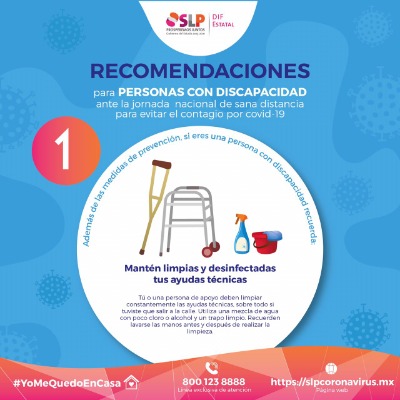 Refirió que si por alguna razón esencial requieren salir con o sin compañía, deben apegarse a las recomendaciones y al regresar a casa limpiar sus ayudas funcionales, para que protejan su salud; es fundamental que la o las personas que les brinden asistencia, también se apeguen a todas estas medidas.