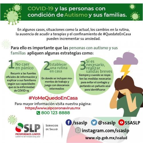 Como parte de las acciones que se realizan para dar atención a todos los grupos de la población, los Servicios de Salud, emitieron algunas recomendaciones para padres, madres y cuidadores de personas con Trastornos del Espectro Autista (TEA), ya que, derivado de las medidas de prevención para evitar contagios de Covid-19 y las actividades de aislamiento social, este conjunto poblacional pudiera caer en cuadros depresivos, de ansiedad y estrés.