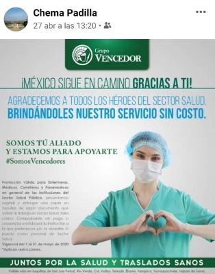 Grupo Vencedor, con su lema "México sigue en Camino Gracias a Ti", lanza esta campaña y dice "Somos tu aliado y estamos para ayudarte, dirigida a enfermeras, médicos, camilleros y paramédicos en general se las instituciones del Sector Salud Público, válido en taquillas de SLP, Ciudad Valles, Tamuín, Ébano, Tampico, Tamazunchale, Jalpan de Serra. Matlapa, Huejutla de Reyes, Pánuco, Huichihuayán, Cómoca y Cárdenas.