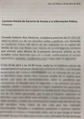 "He sido víctima de una grave ilegalidad por parte del alcalde de la Capital, Xavier Nava Palacios quien de manera prepotente y abusiva del poder que ostenta como Presidente Municipal ha violentado los datos personales de la sociedad potosina llamándole a sus celulares particulares vulnerando la debida protección del derecho a la intimidad y privacidad de datos personales haciéndo uso ilícito de ellos con el pretexto del coronavirus", externó el reconocido analista político.