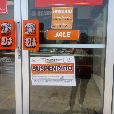 Personal de la Coepris acudió de nueva cuenta a suspender el local de la cadena de pizzas Little Caesar´s ubicada sobre la calle Veracruz de la colonia Obrera en Ciudad Valles por haber desacatado la primera suspensión que recibieron el día de ayer, tras haber incumplido con las medidas preventivas de sanidad bajo las que se les permitió seguir trabajando durante la pandemia.