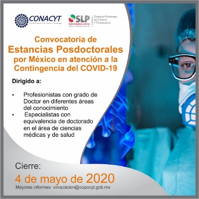 El Consejo Potosino de Ciencia y Tecnología (COPOCYT), dio a conocer que continúa abierta la convocatoria para participar en las Estancias Posdoctorales por México, en atención a la contingencia del COVID-19", del Consejo Nacional de Ciencia y Tecnología (CONACYT), que tiene como objetivo desarrollar proyectos que ayuden a enfrentar los retos relacionados con la pandemia del virus SARS-CoV-2.