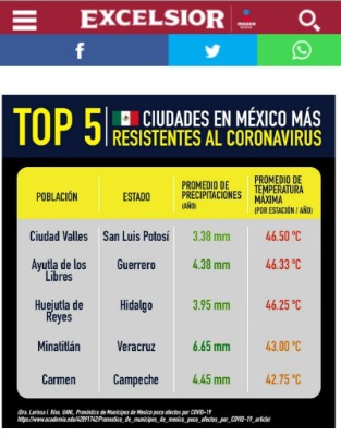En este municipio, ubicado en la Huasteca potosina, la temperatura ha oscilado en los últimos 30 años entre los 35 y 46 grados centígrados; ha tenido precipitaciones de hasta 3.8 mililitros por estación del año; y se encuentra a 200 metros sobre el nivel del mar, "lo cual la posiciona como el primer lugar de todas las ciudades en México que se espera tendrán un microclima más resiliente al Covid-19", afirmó la investigadora Larissa Ríos.