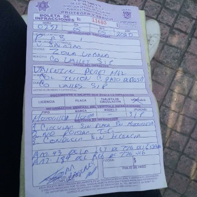Comentó que no pide que no le hagan la infracción, pero que por lo menos les den una prórroga a los motociclistas que no traen documentos por culpa de la Secretaría de Finanzas, además de que los policías no sigan pidiendo mordidas a la gente que de por sí ya no tiene dinero por la crisis del Coronavirus, en su caso, solo trabaja una semana sí y otra no y gana el mínimo, por eso usa la motocicleta para regresar a su casa ya que sale de madrugada de su trabajo y no tiene en qué irse.