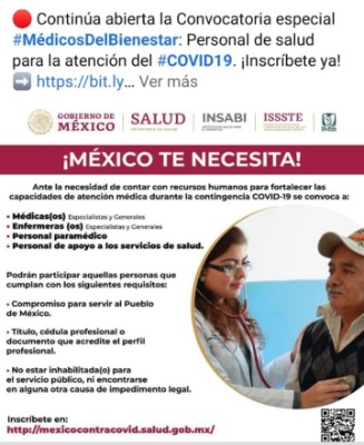Mencionó que quienes estén interesados, pueden subir su currículum a la página www.medicosdebienestar.salud.gob.mx, para que sean contratados inmediatamente.