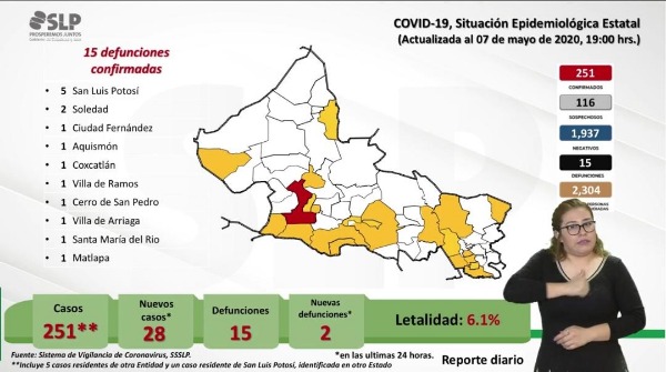 El Director General de Salud Pública, Miguel Ángel Lutzow Steiner, informó que hay 28 nuevos casos, la cifra más alta hasta el momento. Al menos 21 municipios, es decir el 36.2 por ciento del territorio potosino tiene al menos un paciente Covid-19.
