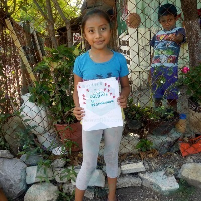 La menor Yamilet Escobedo Ramírez de 8 años de edad, elabora y regala dibujos a las personas que pasan por la calle afuera de su domicilio en la calle Jalisco de la colonia Tipzén con mensajes que tienen como fin el que las personas respeten las medidas preventivas contra el Covid 19, que puede ocasionar muerte.