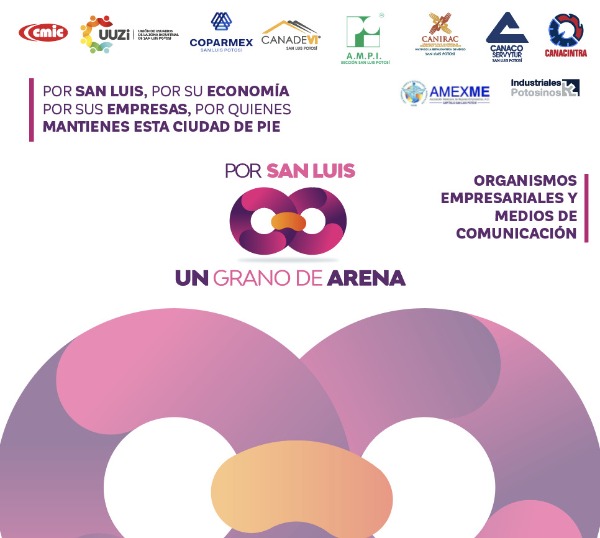 La campaña "Por San Luis, Un Grano de Arena", se implementa por parte de organismos empresariales y medios de comunicación, encaminada a fortalecer a los sectores productivos de la entidad que enfrentan serios problemas por la contingencia sanitaria.