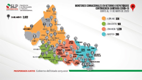 De las 2 mil 22 personas que arribaron de Estados Unidos en medio de la contingencia, el 60 por ciento residen en la Zona Media, siendo el municipio de Rioverde el que más registra paisanos en aislamiento.