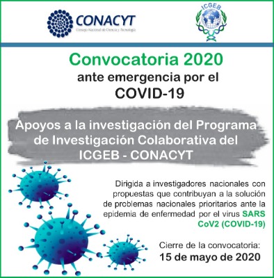 El Centro Internacional de Ingeniería Genética y Biotecnología (ICGEB) y el Consejo Nacional de Ciencia y Tecnología (CONACYT), a través del Consejo Potosino de Ciencia y Tecnología (COPOCYT), invita a participar en la Convocatoria 2020 de Apoyos del Programa de Investigación Colaborativa, en las áreas de ciencias de la vida y salud humana, que den solución a problemas nacionales prioritarios, especialmente para dar atención a la epidemia por el virus SARS-CoV2 (COVID-19), informó la titular de la institución Rosalba Medina Rivera.