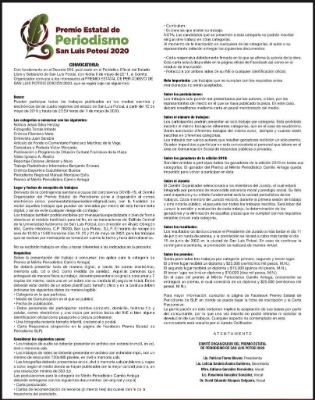 El Comité Organizador del Premio Estatal de Periodismo de San Luis Potosí 2020 dio a conocer la convocatoria para participar en el certamen. Podrán participar todos los trabajos publicados en los medios escritos y electrónicos de las cuatro regiones del estado de San Luis Potosí, a partir del 10 de mayo de 2019 y hasta las 23:59 horas del 1 de mayo de 2020. Se recibirán los días 19, 20 y 21 de los corrientes.