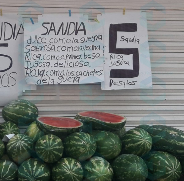 Con un pequeño cartel improvisado ofertan sus productos de la siguiente manera: "SANDIA, dulce como la suegra, sabrosa como la vecina, rica como el primer beso, jugosa, deliciosa, roja como los cachetes de la güera, a 5 pesitos".