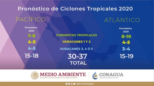 Para este 2020, la Conagua indicó que se pronostica que la Temporada Ciclones Tropicales sea más activa, en promedio se esperan de 30 a 37 fenómenos. En promedio se prevén para la zona del Pacífico Nororiental de 15 a 18 de los cuales pudieran presentarse como tormentas tropicales entre 7 y 8, como huracanes categoría 1 y 2 de 4 a 5 huracanes, como huracanes categoría 3, 4 y 5 en promedio pudieran generarse de 4 a 5 fenómenos, en el caso del Atlántico Norte se pronostican de 15 a 19 huracanes, promediando de 8 a 10 tormentas tropicales, de 4 a 5 huracanes categoría 1 y 2 y huracanes categoría 3,4 y 5 se podrían esperar de 3 a 4 fenómenos climatológicos.