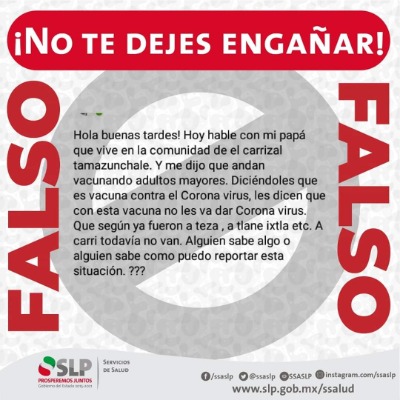 Lo anterior, debido a que han recibido información sobre personas que aparentemente están acudiendo a comunidades de Tamazunchale ofreciéndole a los adultos mayores aplicarles una supuesta vacuna que los va a proteger contra el Covid-19.
