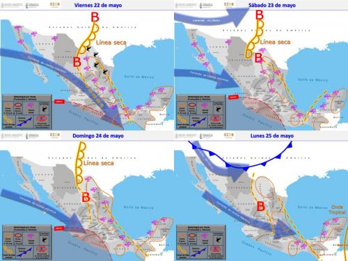 Durante el sábado y domingo una línea seca se extenderá sobre el norte del país, interaccionará con un canal de baja presión en el noreste del territorio nacional y con la entrada de aire cálido y húmedo proveniente del Golfo de México, ocasionando potencial de lluvias intensas acompañadas de actividad eléctrica, granizadas y ráfagas de viento al paso de las tormentas en Coahuila, Nuevo León y Tamaulipas, así como lluvias fuertes a puntuales muy fuertes en San Luis Potosí, Hidalgo, Puebla y Veracruz. El lunes, la aproximación de un frente frío a la frontera norte de la República Mexicana mantendrá las lluvias fuertes a muy fuertes en el noreste y oriente de México.