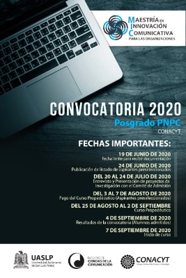 La Maestría en Innovación Comunicativa para las Organizaciones (MIC) que se imparte en la Facultad de Ciencias de la Comunicación (FCC) de la UASLP cerrará inscripciones el próximo 19 de junio de 2020. Por lo cual, se extiende una invitación a los interesados en formar parte de la quinta generación a que consulte la convocatoria correspondiente y participe del proceso de selección de sus estudiantes.