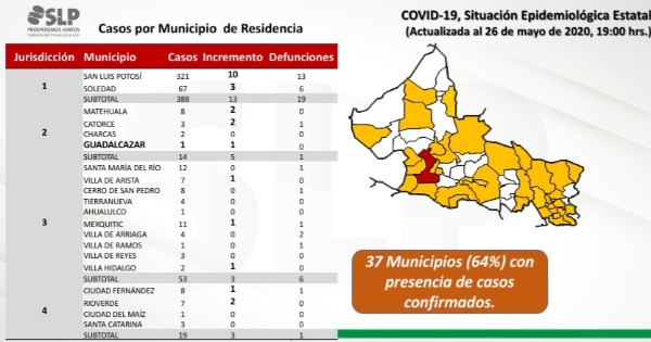 Este día, el municipio de Guadalcazar debutó en la lista de los que mantienen casos positivos de Covid-19, con lo que el virus ya mantiene presencia en 37 municipalidades, abarcando así un territorio total del 67 por ciento.
