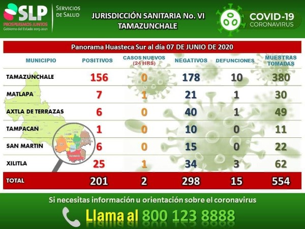 Agregó que en total en la huasteca sur se contabilizan 201 casos, de ellos Tamazunchale se mantiene en 156 casos, Matlapa 7, Axtla y San Martin 6 cada uno, 1 en Tampacán y 25 en Xilitla; así como 15 defunciones, que representan el 19% de las registradas en el estado.