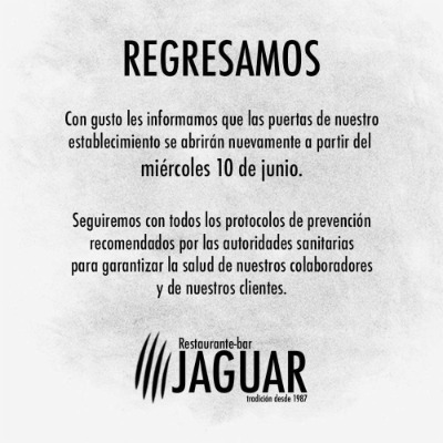 El Restaurante-Bar El Jaguar, anuncia a los Vallenses que reabre sus puertas en su domicilio de Galeana, entre Niños Héroes y Rotarios, luego de la pausa que se vivió por la pandemia del COVID 19.