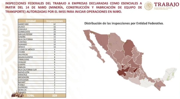 SLP fue mencionado en el 6to lugar con 20 de las 329 visitas de inspección realizada, en donde la Secretaría del Trabajo detecto que casi un 42% inició actividades cumpliendo las medidas, aunque también hay quien no ha iniciado, la empresa se encuentra cerrada, no se permitieron las visitas, inició actividades pero no cumple con las medidas, y un 5.17% de empresas que no se encontraron en el domicilio indicado.