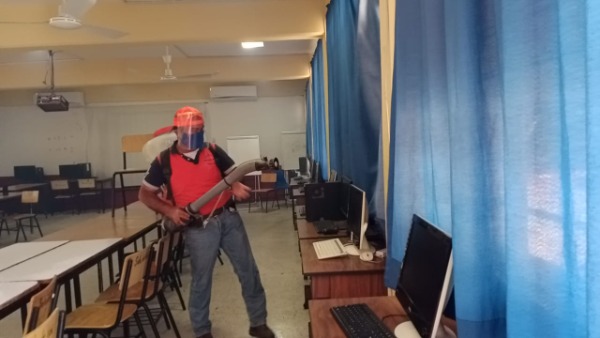 Con bombas aspersores en mano y cubiertos con trajes blancos para protegerse de algún contagio se metieron a los salones para realizar el saneamiento, también lo hicieron en la parte de afuera.