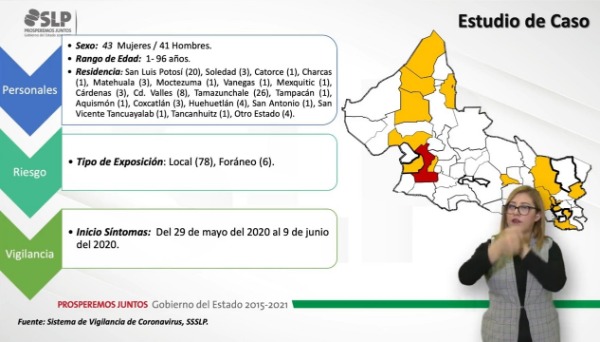 Sobre los nuevos 84 casos positivos a coronavirus, se detalló que se trata de 43 mujeres y 41 hombres, en un rango de edad de entre 1 y 96 años; mismos que tienen como residencia en 20 la capital potosina; tres en Soledad de Graciano Sánchez; una en Catorce; una en Charcas; tres en Matehuala; una en Moctezuma; una en Vamegas; una en Mexquitic de Carmona; tres en Cárdenas; ocho en Ciudad Valles; 26 en Tamazunchale; una en Tampacán; una en Aquismón; tres en Coxcatlán; cuatro en Huehuetlan; una en San Antonio; una en San Vicente; una en Tancanhuitz y cuatro de otros estados; cuyo tipo de exposición se determinó como 78 locales y seis foráneas; mismas que habrían iniciado síntomas durante el periodo del 29 de mayo al 9 de junio.