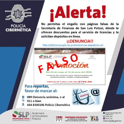 A través de páginas de Facebook así como de mensajes de whatsapp, defraudadores hacen circular una imagen en donde ofrecen licencias de conducir para servicio particular en las modalidades de automovilista, chofer y motociclista, por 4 años a un costo de $799.00. dicha cantidad piden se pague en línea para lo que habilitaron una página falsa http://slpfinanzas.gob.mx.promolicencias.pagedemo.co/
