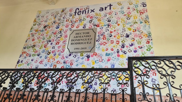En este sitio estaba instalado un mural de la pintora Pilar Vidales que fue retirado hace unos meses y ahora luce esta manta con cientos de manos pintadas a colores y con una placa en medio que dice Héctor Armando Domínguez Rodríguez 1991-2019.