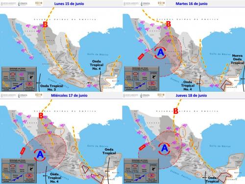 El martes, una nueva onda tropical se aproximará a las costas de Quintana Roo, misma que ingresará y recorrerá la Península de Yucatán y el sureste de México durante el miércoles y jueves, interaccionará con canales de baja presión extendidos sobre el oriente y sureste del territorio nacional, provocando lluvias fuertes a muy fuertes, actividad eléctrica y posibles granizadas en las mencionadas regiones, con tormentas puntuales intensas en Veracruz, Oaxaca y Chiapas.