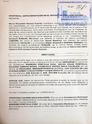 La denuncia fue presentada este jueves ante la Vicefiscalía Anticorrupción de San Luis Potosí, una denuncia formal en contra de Rodrigo Portilla Díaz, Oscar Valle Portilla Ricardo García Rojas y Francisco Xavier Nava Palacios.
