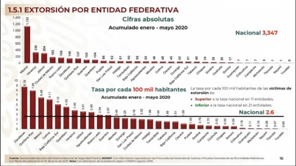 El estado potosino aparece en la gráfica de las extorsiones con 62, a la cabeza se encuentra el Estado de México con 1,131 y al final Yucatán con cero.