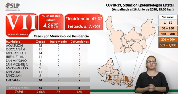 Los casos en los municipios permanecen de la siguiente manera: Aquismón se encuentra con 25, Coxcatlán con 11, Tancanhuitz con 14, Huehuetlán con 11, San Antonio con 4, San Vicente 4, Tampamolón 2, Tanlajás con 11 y Tanquián 6 casos.