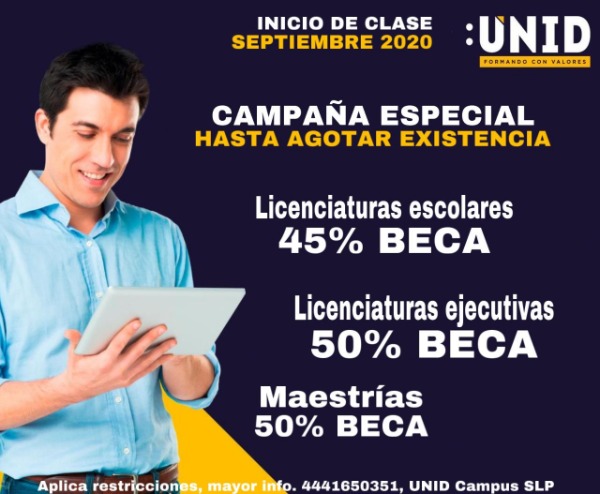 Derivado de la contingencia sanitaria por Covid-19, la Universidad Interamericana para el Desarrollo (UNID) cuenta con campañas especiales para el próximo ciclo escolar, por lo que hace extensiva la invitación para que se comuniquen directamente a la institución al teléfono 4441- 650351.