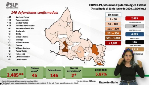 Durante la rueda de prensa virtual de este día, autoridades de los Servicios de Salud del Estado, informaron que la cifra de casos positivos de Covid-19 se incrementó a dos mil 485 casos, tras detectar 45 nuevos pacientes; en tanto que, el número de defunciones asciende ya a 146 víctimas. En la actualización de este día, Ciudad Valles presenta 335 contagios con 15 defunciones.