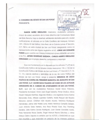 En el documento fueron claros al señalar que, en caso de incumplir, se advirtió que existe una pena de tres a nueve años de prisión, multa de 50 a 500 días, destitución e inhabilitación de tres a nueve años para desempeñar otro cargo público, tanto de Xavier Nava Palacios, como del Primer Síndico, Víctor José Ángel Saldaña; Alicia Nayeli Vázquez Martínez, quien funge como Segundo Síndico y los regidores Dulce Karina Benavides Ávila, Alfredo lujambio Cataño, María Raquel del Rosario Hernández, Jaime Uriel Waldo Luna, María Verónica Campillo Salazar, Juan Antonio Salas Herrera, Ana Rosa Pineda Guel, Eloy Franklin Sarabia, Lidia Karina Zavala Rodríguez, Juan Daniel González Ayala, Frida Fernanda Rosas Zárate, Ángel Manuel Reyna Sánchez y Alma Mireya Cerino Zapata, por los actos y omisiones en que han incurrido y que reanudan el perjuicio de los intereses públicos fundamentales y su buen despacho, respecto del correcto funcionamiento del ayuntamiento de San Luis donde transgreden los derechos humanos y fundamentales.