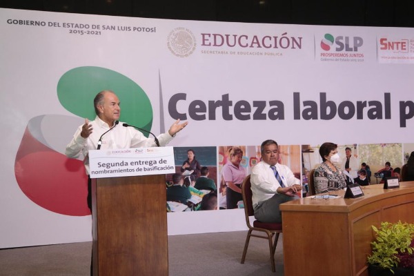 La basificación a 1 mil 466 maestras y maestros potosinos es un logro histórico para San Luis Potosí, por la certeza laboral que es uno de los elementos necesarios para el desarrollo personal y profesional, así como para alcanzar la calidad educativa, señaló el Gobernador del Estado, Juan Manuel Carreras López, al encabezar una ceremonia virtual de entrega simbólica de nombramientos, en la que, además del Secretario de Educación, Joel Ramírez Díaz, participaron a distancia el Secretario de Educación Pública, Esteban Moctezuma Barragán y el Secretario General del Sindicato Nacional de Trabajadores de la Educación (SNTE), Alfonso Cepeda Salas.