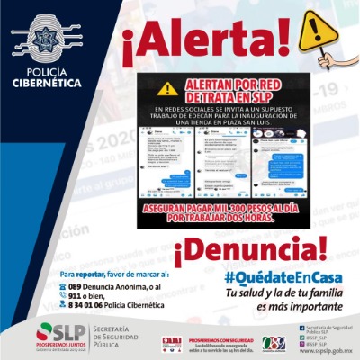 Como parte de los trabajos que realiza la Secretaría de Seguridad Pública del Estado (SSPE) por medio de Policía Cibernética, se emite una alerta a la ciudadanía, especialmente a las y los jóvenes, sobre presuntas ofertas de empleo, de forma pública o privada en redes sociales, que pueden ser meros ganchos para la comisión de delitos que pueden ir desde la extorsión hasta secuestros virtuales.