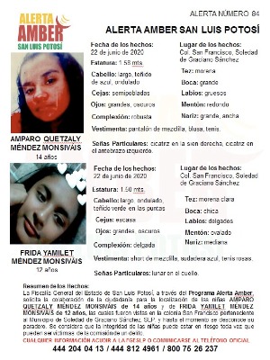 La Fiscalía General del Estado de San Luis Potosí (FGESLP) activó una Alerta Amber para apoyar a la localización de las menores, Amparo Quetzaly de 14 años y Frida Yamilet de 12 años de edad, ambas de apellidos Méndez Monsiváis, quienes fueron vistas por última vez el 22 de junio del 2020, en la colonia San Francisco, perteneciente a Soledad de Graciano Sánchez.