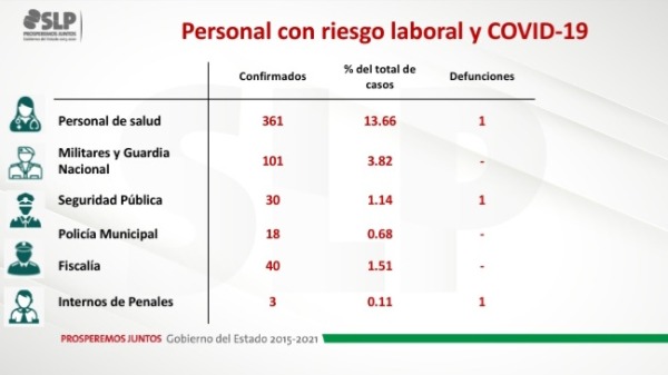 Los Servicios de Salud en el Estado, dieron a conocer la cifra de 553 contagios de coronavirus entre personal de salud, seguridad pública, dependencias estatales y reclusos de penales en las diferentes regiones del estado potosino, de los cuales, se registró en días pasados el deceso de tres personas.